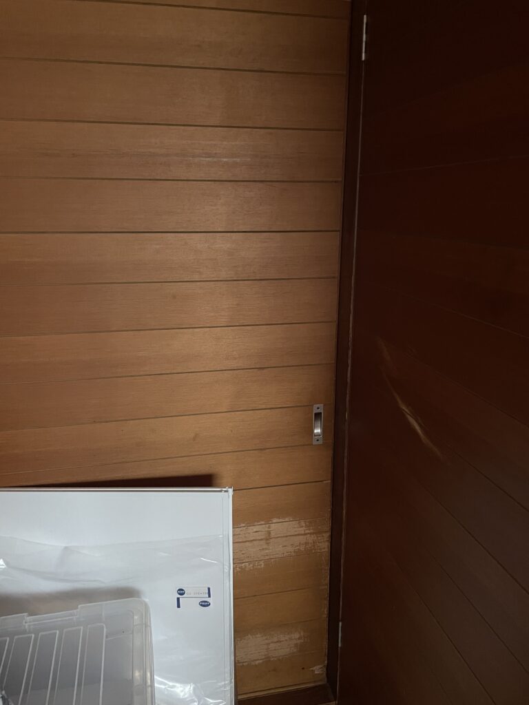 入り口は引き戸ですが、もともと鍵なしだったので引っかけタイプの簡単なカギをつけていました。ただ、最近そのカギが外れて行方不明だったので、外出するときは写真に写っているパネルをドアの前に立てかけて簡単に開けられないようにいう工夫をし、なおかつ猫の良心を信じてやりすごしておりました。