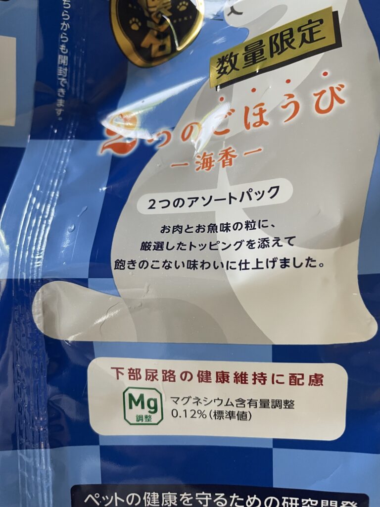 マグネシウム含有量が0.12%です。「2種の尿石ケア」は0.09%なのでくらべるとかなり高い。おいしさを求めているエサだと思うので、しょうがないと思います。尿路結石の子にはあげなきゃいいだけなのです。