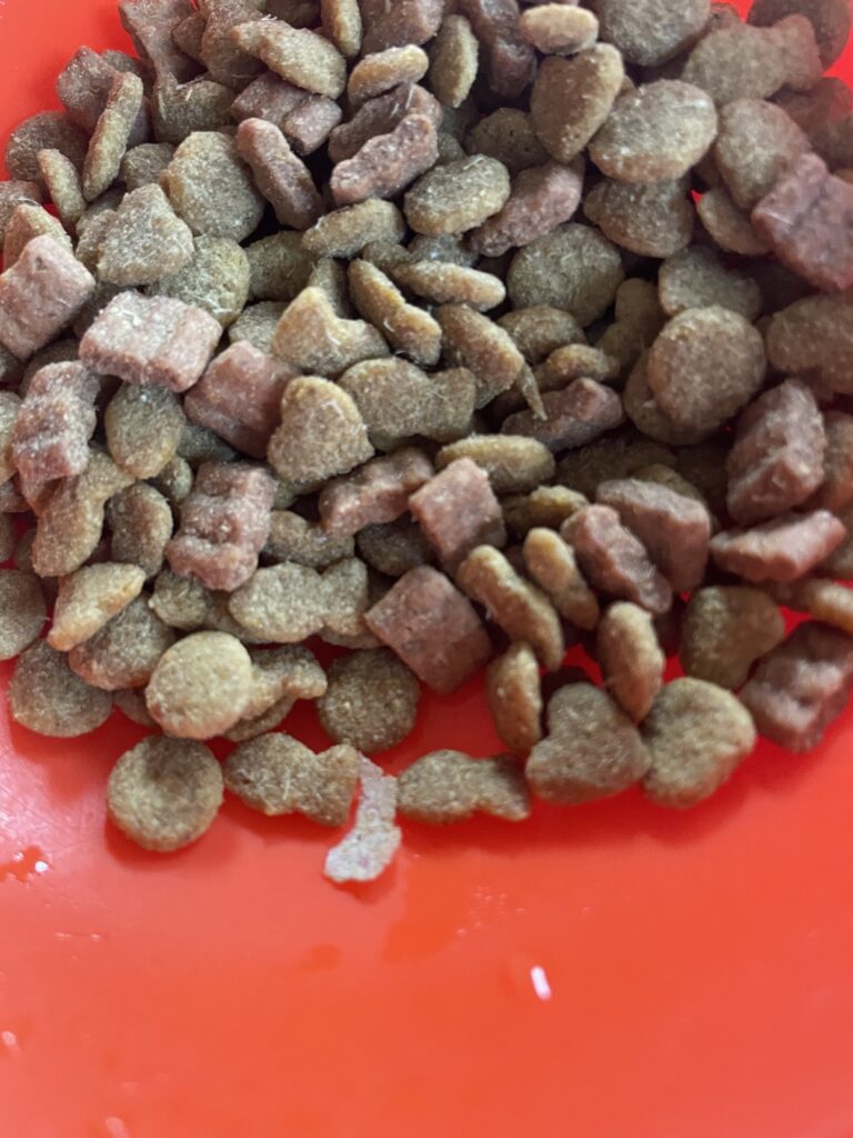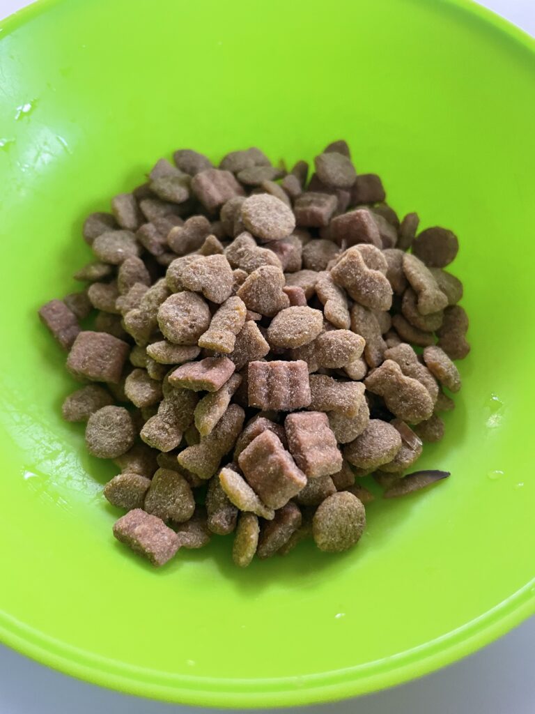 派手な袋のアピールとは裏腹に存在感を消している煮干しさん…。ひょっとして猫が食べやすいように粒々にまとわせたから見えないのかもしれないな、とポジティブに考えます。