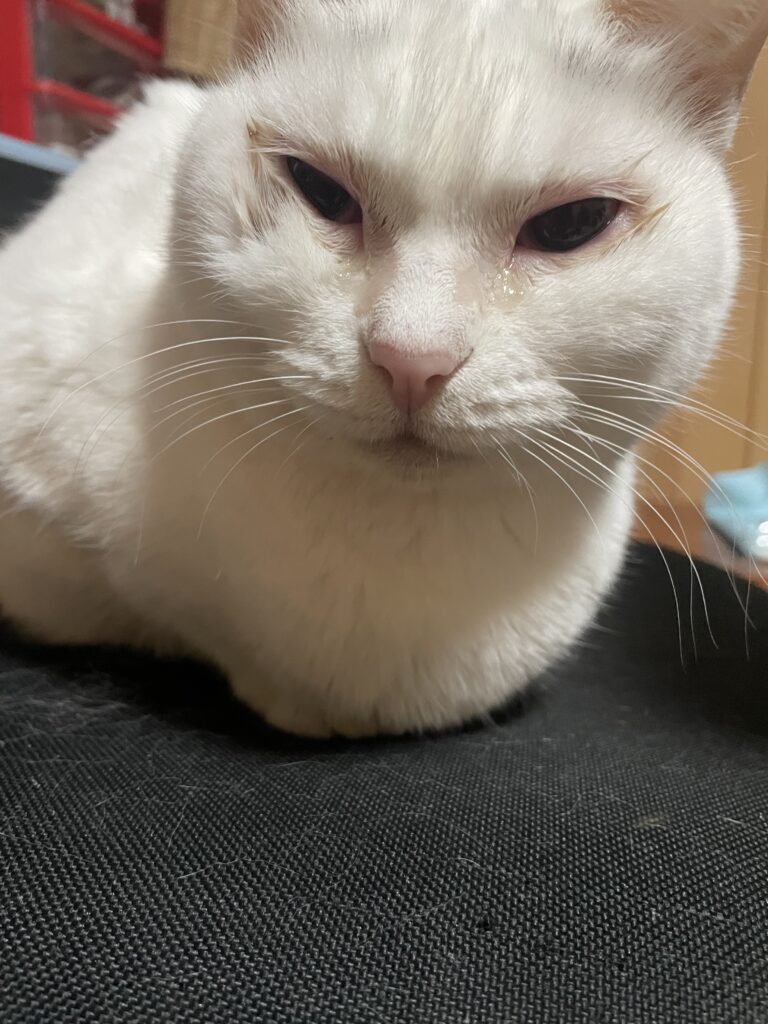 なんだか目元がキツそうで、そのせいか目が吊り上がって見た目も変わっています。わが家の病院ルール、「3日間様子見でそれでもだめなら病院送り」を適用し、涙を確認してから3日目に行きつけの病院へ連れて行きました。