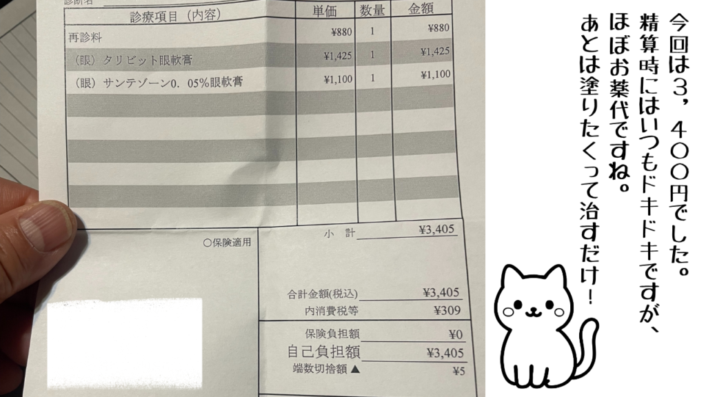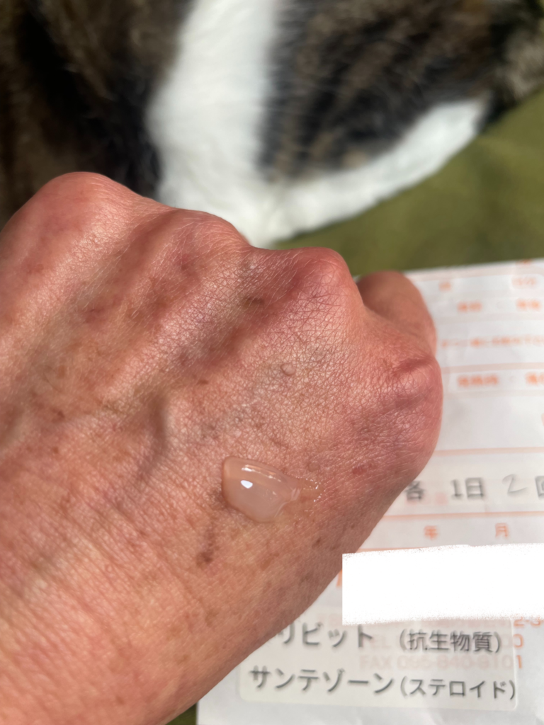 お薬は目薬にしますか?と聞かれたのですが、前に猫風邪でもらった目薬を差すのが不可能であると悟ったため、軟膏にしてもらいました。ステロイドと抗生物質の2つです。