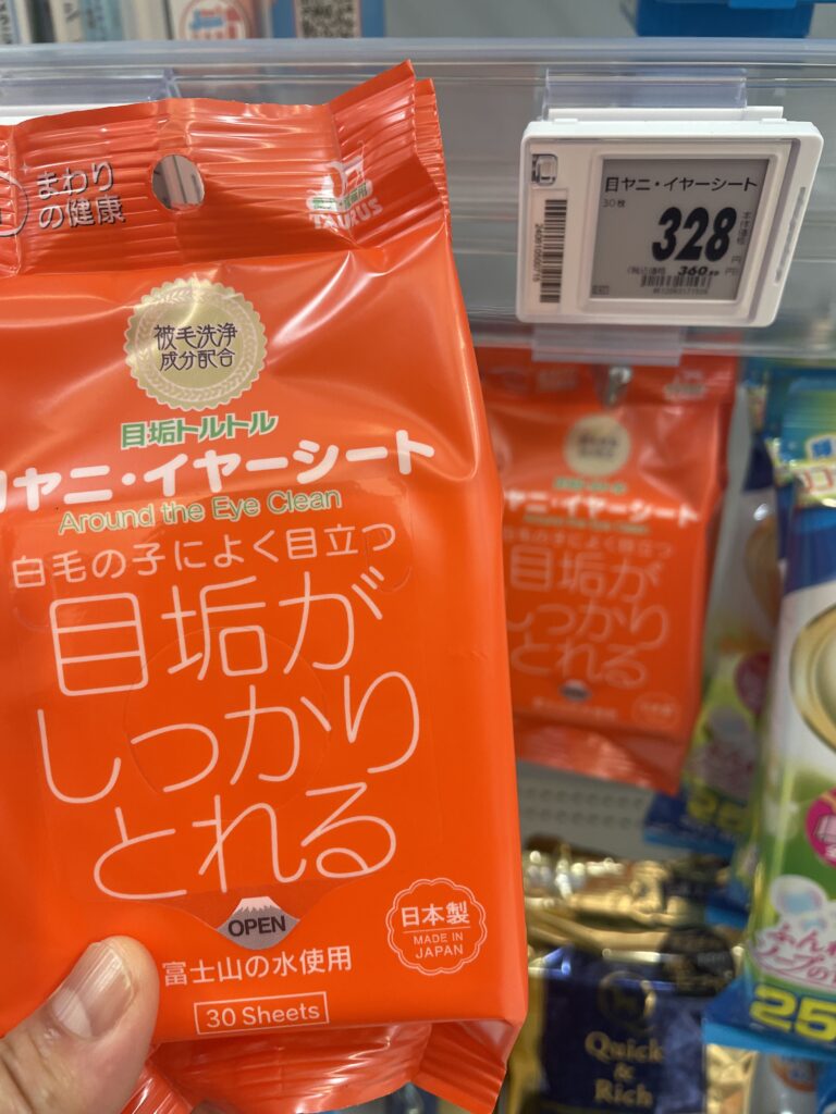 人間の赤ちゃん用お手拭きシートをペットに使うこともできるのですが、目の周りというデリケートな場所を拭きたいこともあり、製品の「白毛の子によく目立つ」という表記が心に響いたので、