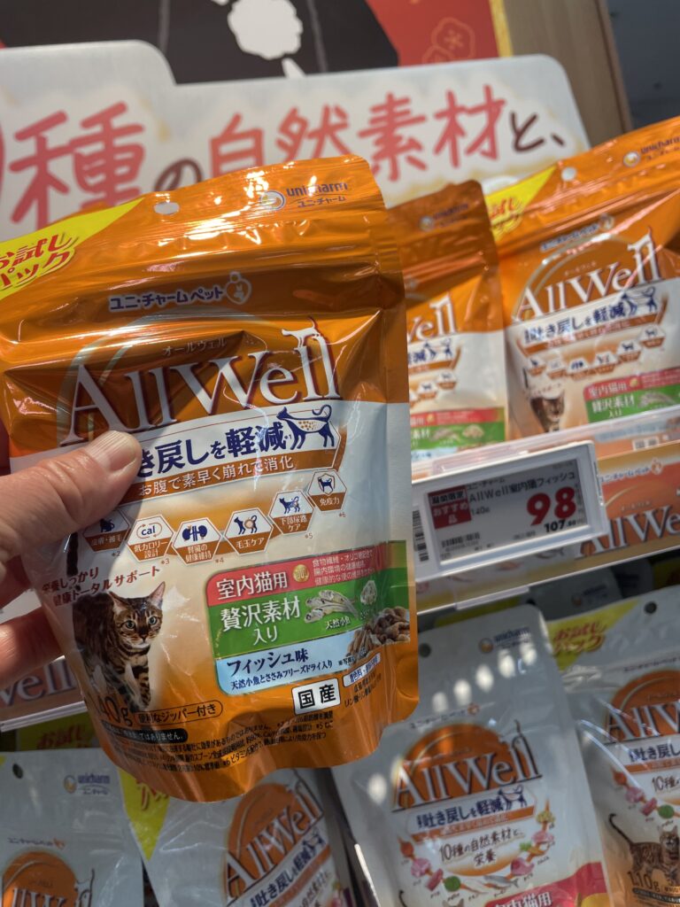オールウェル「室内猫用 贅沢素材入りフィッシュ味」!これも98円でした。140g入っているので1.5個くらいが1回の食事量となりそうです。コレはカリカリに天然小魚とささみのフリーズドライが入っているので食いつきがいいんです!とりあえず6個くらいピックアップしましたよ。
