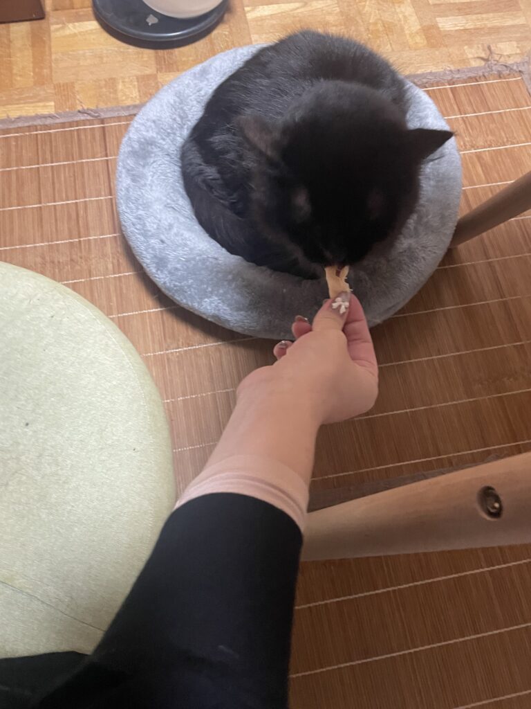 滅多に実家に寄れないので、寄れるときにはお土産をあげて印象を良くしたいそうです。人間にではなく、猫に…