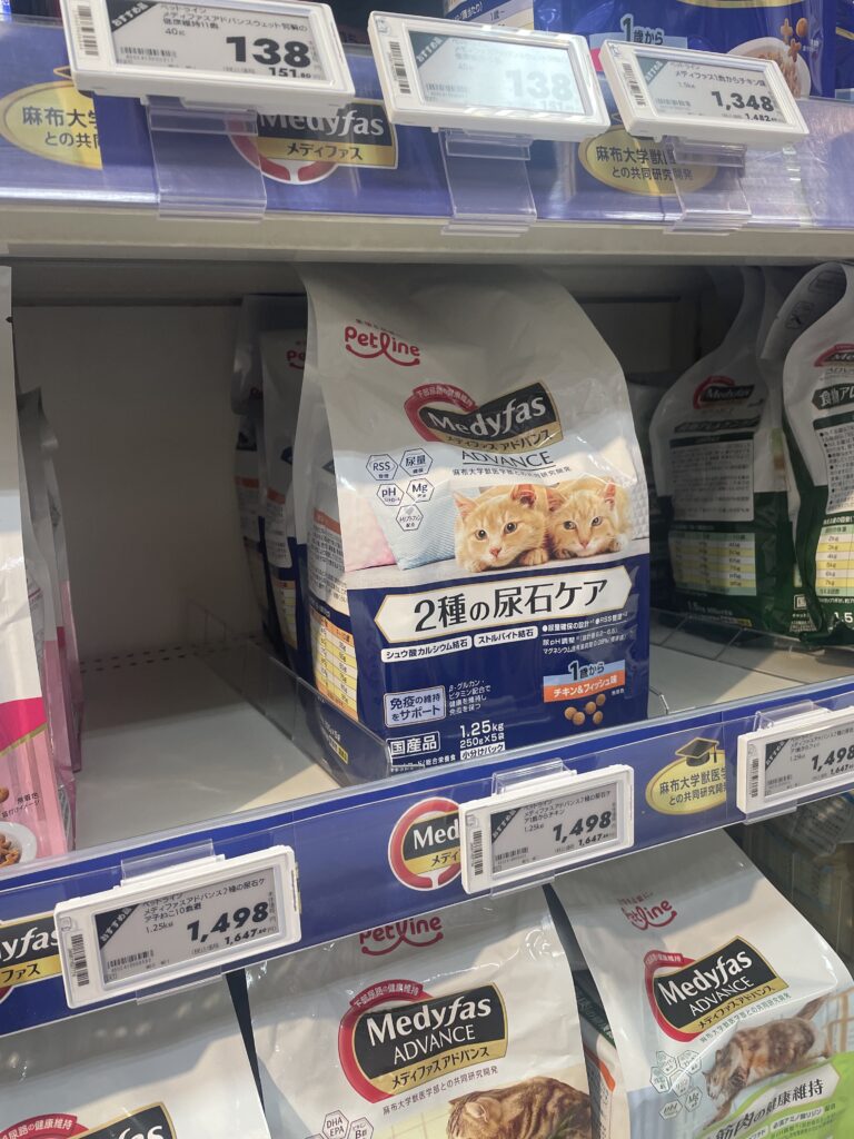 そして絶対に切らしてはならないエサ!わが家の最近の定番はメディファスアドバンス「2種の尿石ケア」!いつも買いに行くダイレックスがどういうわけかここ2週間近く置いてくれていないため、高いけどしぶしぶイオンで買っていました。それなのに…