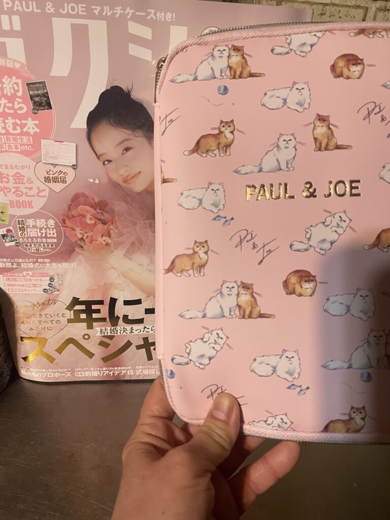 最後は正月に買った猫ちゃんグッズってことでご紹介。これはセブンイレブン限定品。お正月スペシャルで結婚情報誌ゼクシィの付録が猫ちゃん柄のポール&ジョー、マルチケースだったので、結婚の予定は全くないのですが買いました!