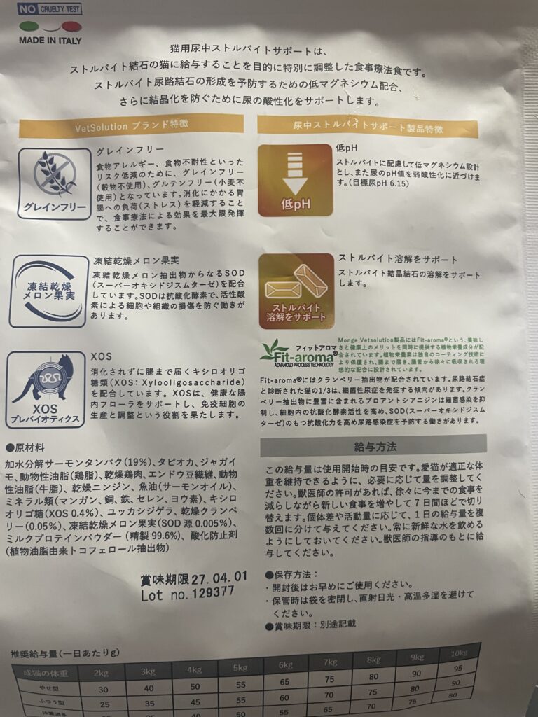 商品の原材料は、サーモンタンパクが主原料なのでフィッシュ味なのかと思うのですが、加水分解サーモンとあるので、ひょっとしてマズく分解されちゃったのかな?と思ったり。オシッコの調子を整えてほしいと願う飼い主さんにはグレインフリーだったり、抗酸化酵素のメロン果実だったり、クランベリー抽出物だったり、ストルバイト溶解をサポートする働きだったりが、まるっとありがたく思えるのですが、肝心の猫ちゃんが