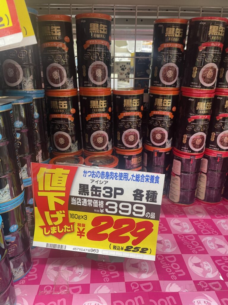 こちらはドンキに限らずいろんなスーパーでも見かける黒缶!229円に値下げですよ。めまい…