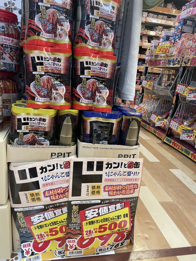 売り場でまず目に入ったのがドンキPB商品の8缶入り猫缶!8個も入って500円の安値宣言になってます!