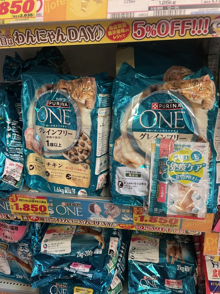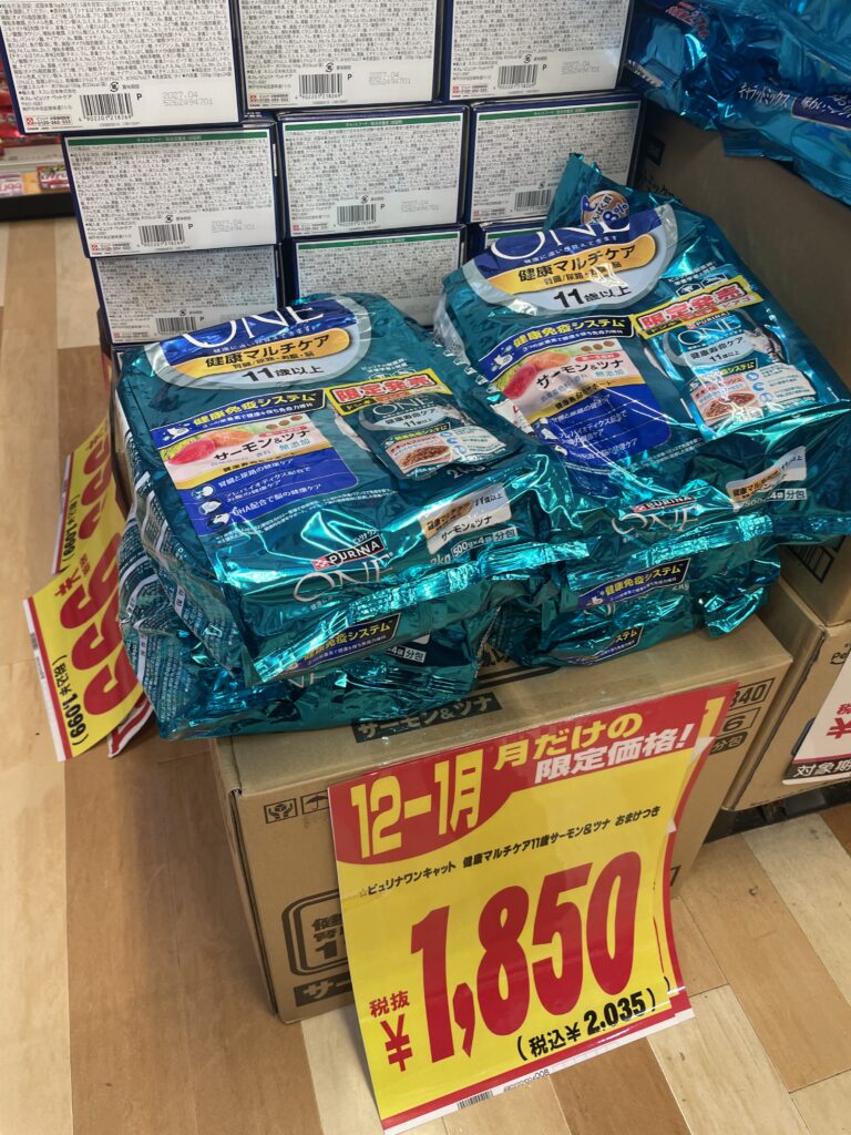 こちらは12月~1月までの期間限定ですが、お高いピュリナワンが限定価格1,850円!近所の激安スーパー、ダイレックスでも2,137円だったのに!287円もの違いに驚きを隠せません。