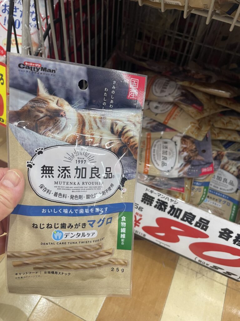 写真のねじねじシェイプのマグロ味オヤツが80円(税別)!