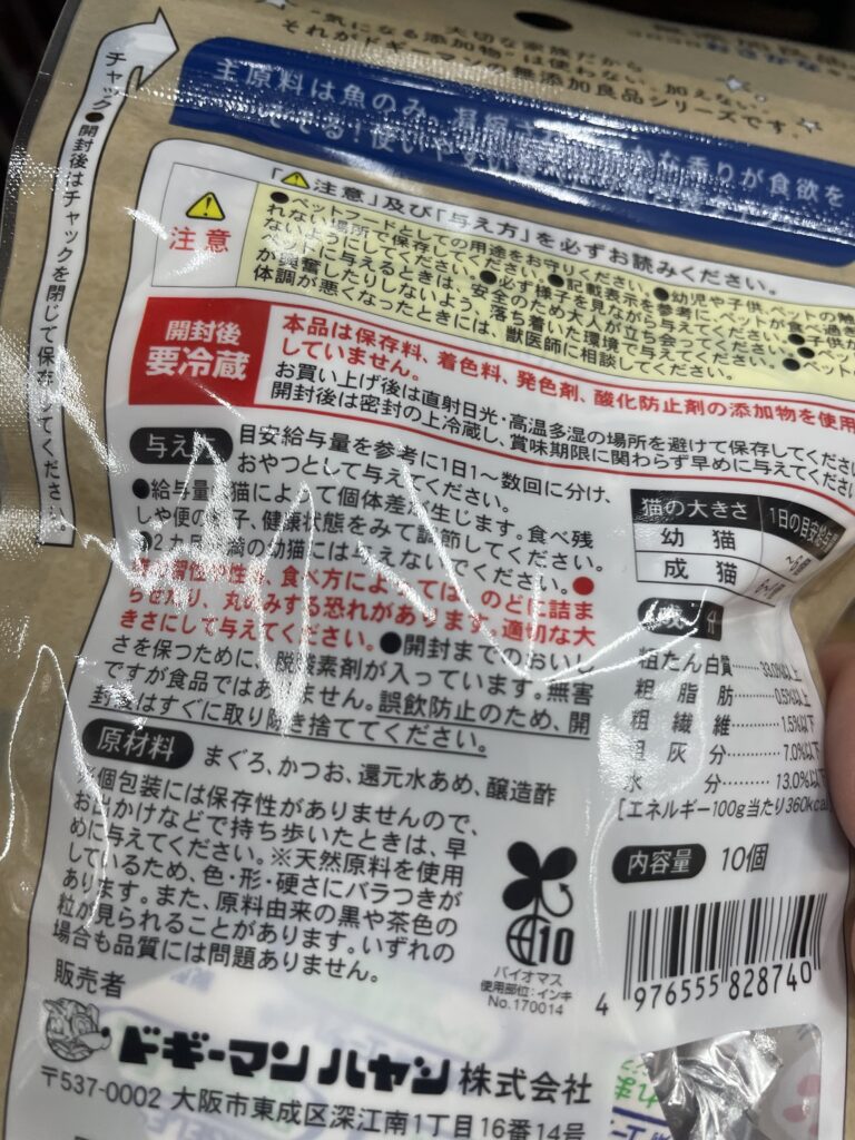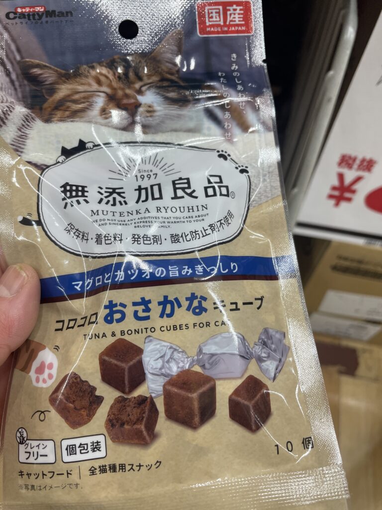 おやつなんて盆暮れ正月くらいしかあげてないような気がしますが、ちょっと財布のひもを緩めてやってもいいかな?と思い、今回は個包装のコロコロおさかなキューブを2袋カートイン!
