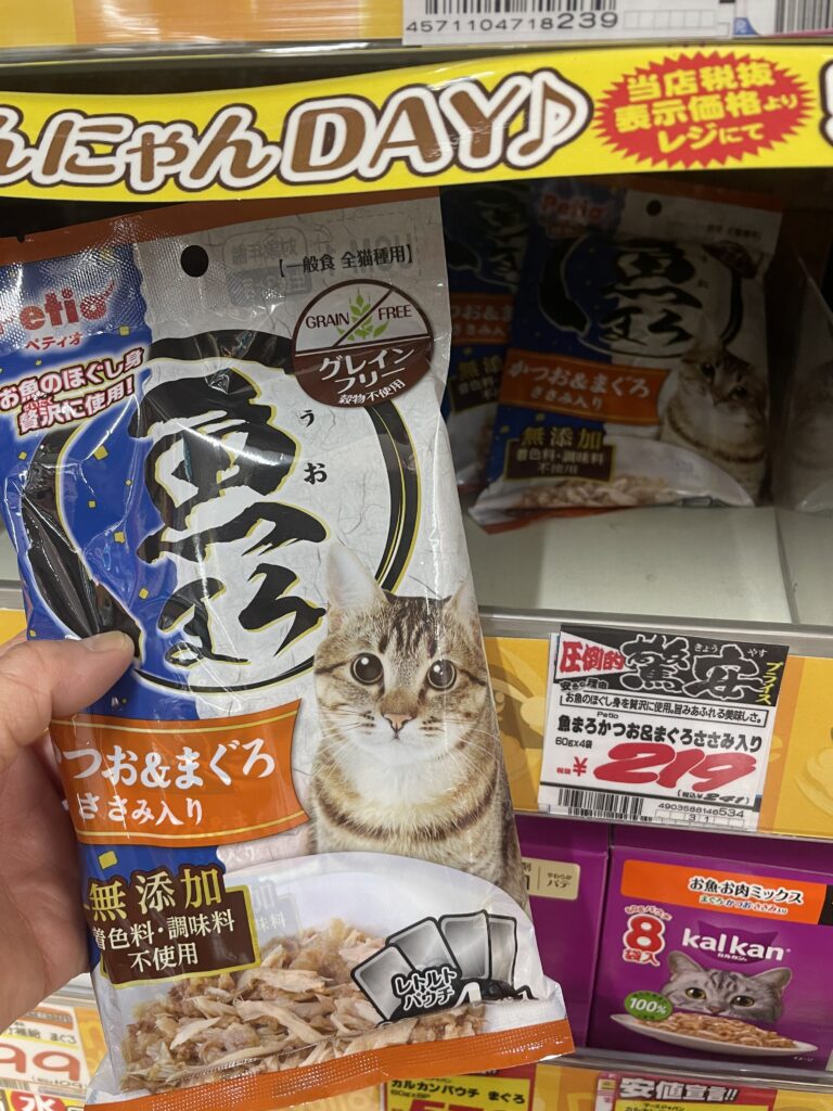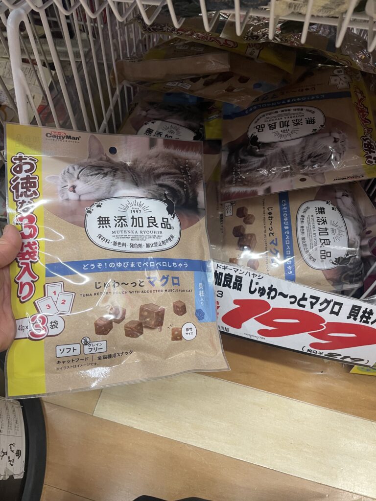 ドンキといえば、8缶入りで500円のネコ缶がありますが、今回はあまりにもかさばるし、重いしで無理という判断です。薄くてかさばらなくて、でも4袋。こんなときにはありがたいです。