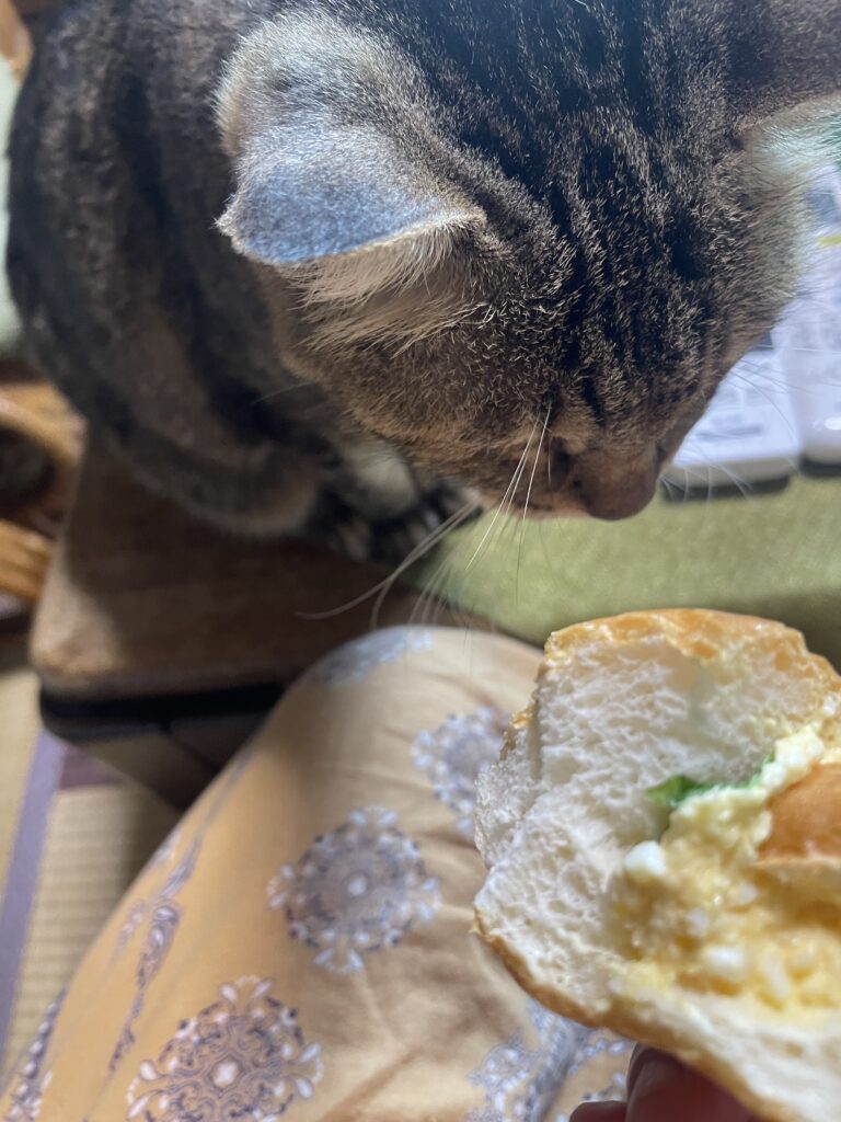 それは私がお昼のパンを食べていた時、私のモモでくつろいでいたしまちゃんが食べ物のニオイに反応したのです。