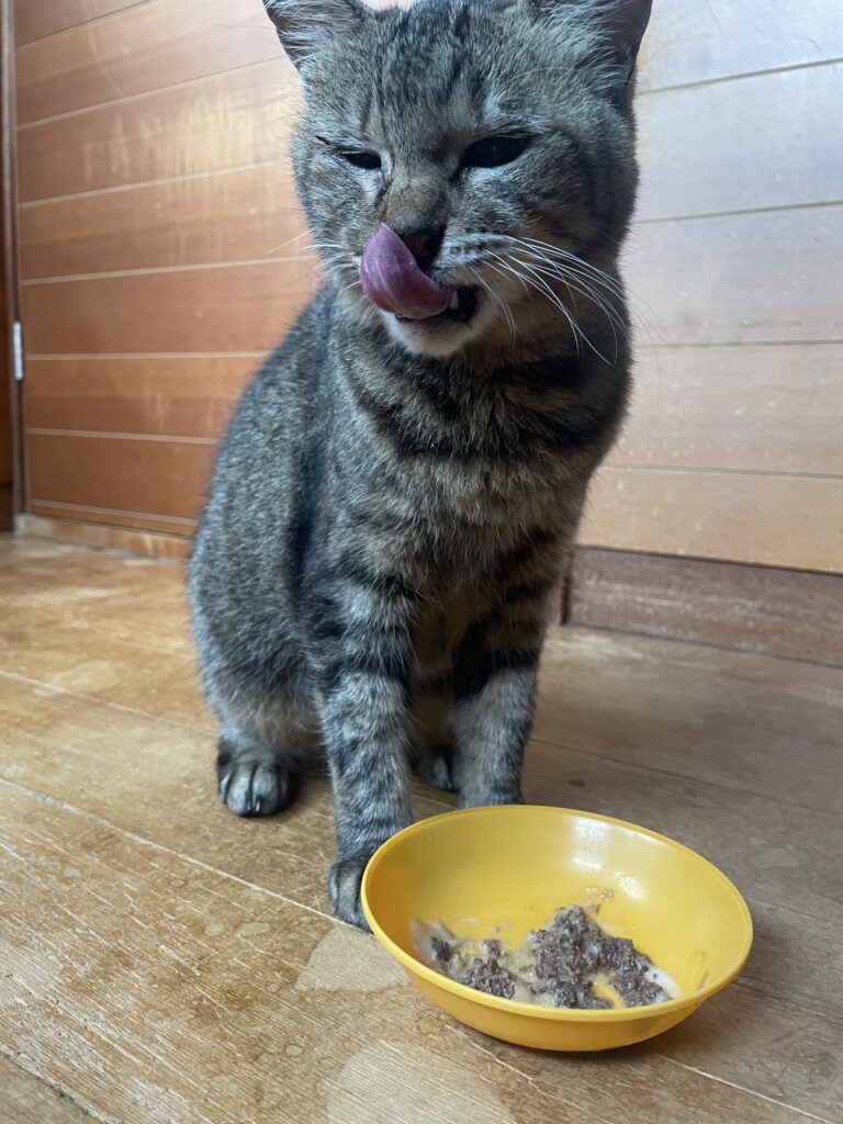 絶食に近い状態で2日間過ごしていたので、急にいつも通りのエサをあげると胃袋がビックリすると思い、まずはちゅーるをなめて胃袋を慣らす作戦です。