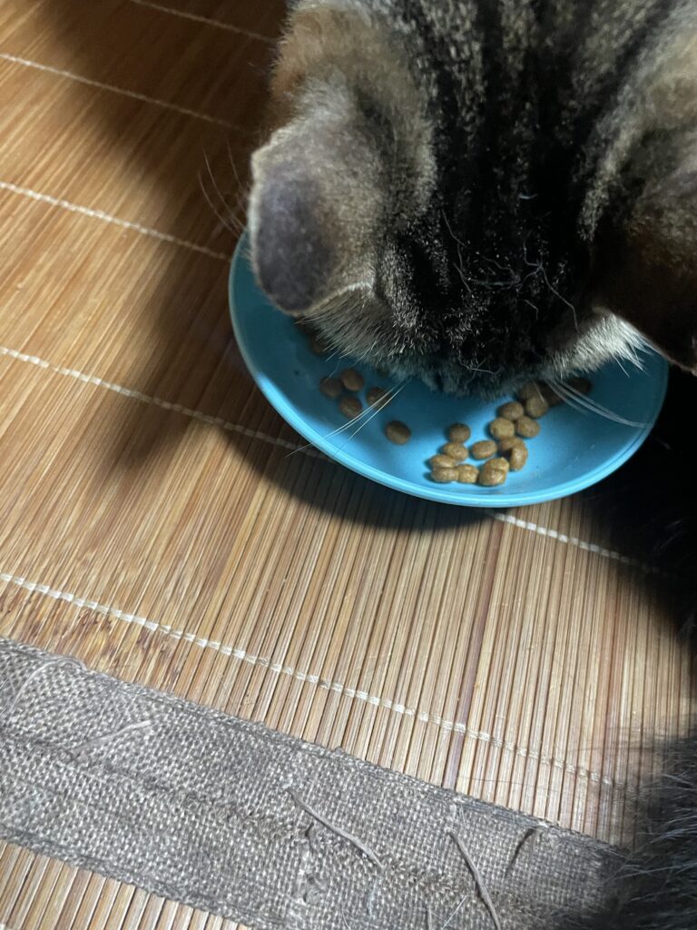 他の猫ちゃんズはカリカリだけなので、しまちゃんだけ別の場所で夕方のエサを用意しました。総合栄養食のペースト&猫缶を少量、皿に入れて。